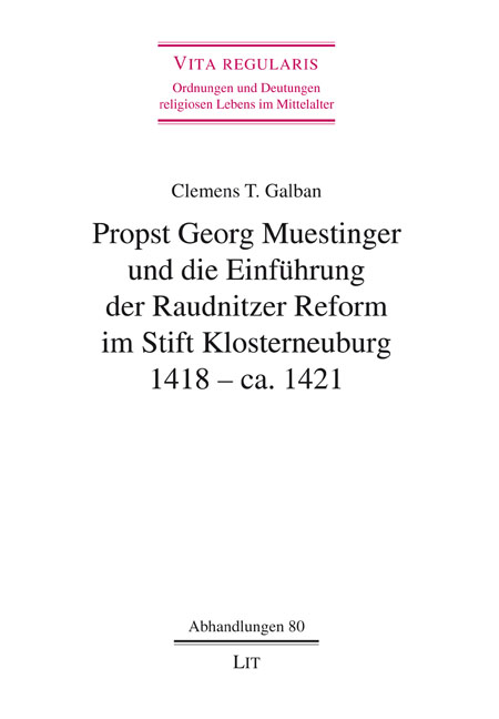 Clemens T. Galban, Propst Georg Muestinger und die Einführung der Raudnitzer Reform im Stift Klosterneuburg 1418 — ca. 1421, Bd. 80, 2021, 340 S., 34.90 EUR, br., ISBN 978–3‑643–51085‑3. Jetzt bestellen